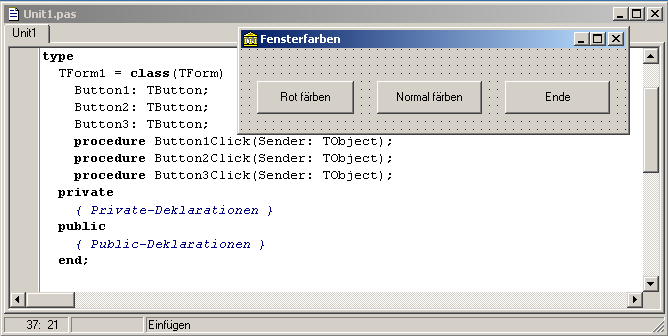 Allerdings sind nicht alle möglicherweise erwarteten Eigenschaften des Knopfes auf diese Art und Weise zugänglich. Zum Beispiel scheitert der Versuch, die Farbe des Knopfes zu ändern. Die Farbe ist nämlich keine Objekt-Eigenschaft des Objekttyps TButton: es gibt daher keine Eigenschaftsvariable Button1.Color. Andere Objekte (wie z.B. das Formular) haben eine solche Eigenschaft: mit